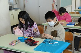 巾着袋を作っていきます。まず、刺しゅうをしています。