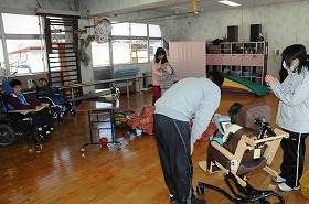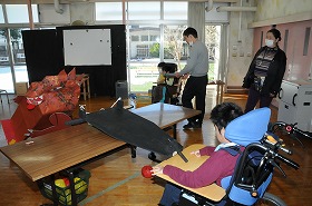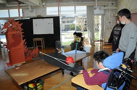 手作りボールをゴムを使って飛ばし、クラッシュザウルスを倒すゲームをしています。