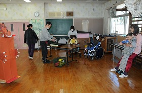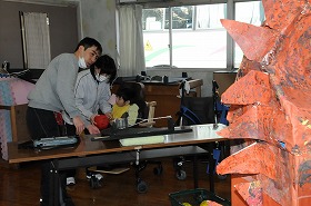 手作りボールをゴムを使って飛ばし、クラッシュザウルスを倒すゲームをしています。