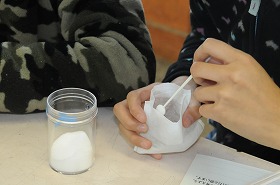 食塩とミョウバンを水に溶かす実験をしています。
