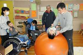 大きなバランスボールを使った体の取り組みを、交代でやっています。