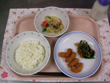 今日の給食は、ご飯・いかのかりん揚げ・塩肉じゃが・野菜ののり和え・牛乳でした。