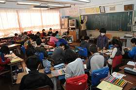 自分の生活を振り返り、直したいところを節分の鬼に見立ててカードに書いています。