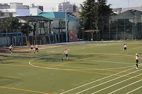 なわとびのかけ足とびの練習をリレー形式で行っています。