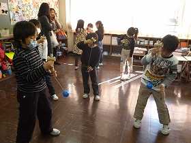 けん玉やあやとり、こまなどを使って遊んでいます。