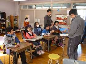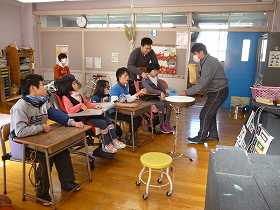 今日は紙ずもう大会をやります。相撲の行司が使う拍子木で授業の始まりです。