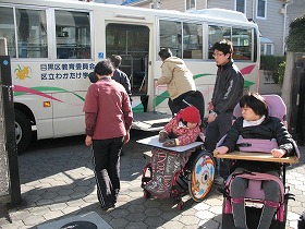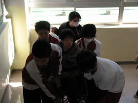1組の生徒が四中で琴の体験をします。四中の生徒が車いすを階段で持ち上げています。