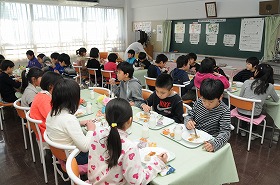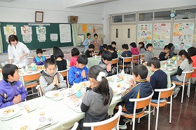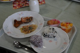 先日考えた「栄養のバランスがいい食事」の実践編として、栄養のバランスを考えながら自分でメニューを選びます。選んだ食事を食べています。