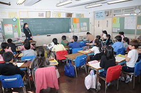 くらしの道具として、洗濯板を使って洗濯をする学習の進め方を確認しています。