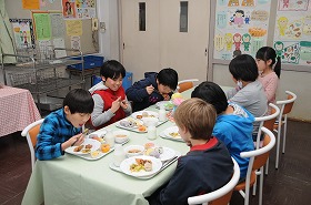 今日は4年1組の子どもたちが、先日考えた「栄養のバランスがいい食事」の実践編として、バイキング給食を行っています。