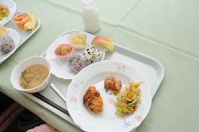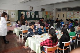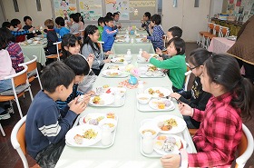 今日は4年1組の子どもたちが、先日考えた「栄養のバランスがいい食事」の実践編として、バイキング給食を行っています。