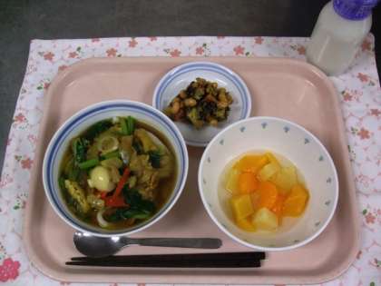 メニューは、カレーうどん・岩石揚げ・フルーツポンチ・牛乳でした。