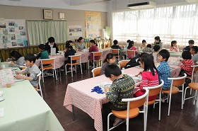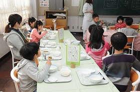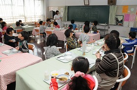 今日は2年2組の子どもたちがランチルームで給食を食べています。