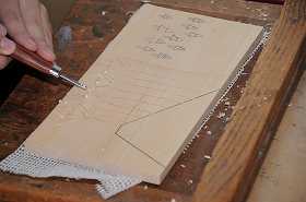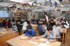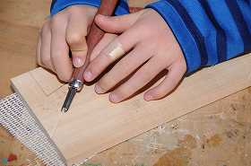 「私はデザイナー」をテーマに、彫刻刀を使い、デザインにそって木彫しています。
