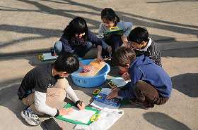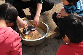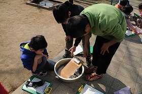 生活の道具として使われていた洗濯板を実際に使って、洗濯をしています。