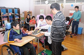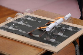 プラスチックの反動を利用した手作り教具を使ってゲームをしています。