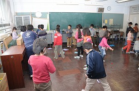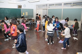 2年生が1年生に昔遊びを教えています。この教室の昔遊びは、けん玉です。