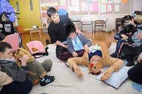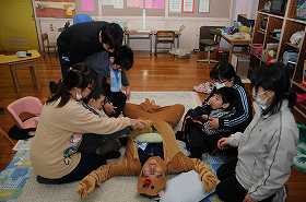 赤ずきんちゃんの一場面を動作化しています。オオカミが食べたものをお腹から助け出しています。