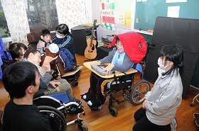 赤ずきんちゃんの一場面を動作化しています。オオカミが赤ずきんちゃんに話しかけています。