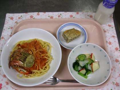 メニューは、渡り蟹のトマトクリームスパゲティー・かぶとりんごのサラダ・紅茶のケーキ・牛乳でした。