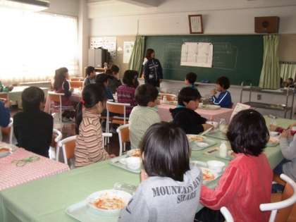 また、今日は健康トレーナーの竹村先生にランチルームで一緒に給食を召し上がっていただきました。そして「正しい姿勢について」というお話をしていただきました。