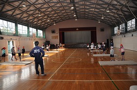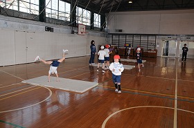 手を使ってマットを跳び越す遊びをしています。健康トレーナーが授業支援をしています。