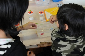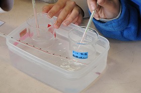 温度を上げた水に食塩やミョウバンがどのくらい溶けるかを実験しています。
