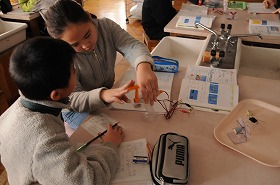 手回し発電機で電気を付ける実験をしています。