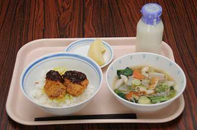 今日の給食は、みそカツ丼・のっぺい汁・果物(りんご)・牛乳でした。