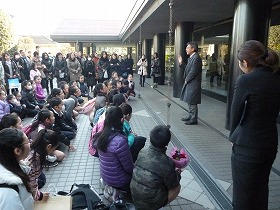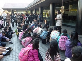 油面小合唱団が東京都小学校音楽教育研究会合唱祭に参加するために、府中の森芸術劇場に来ています。演奏が終わり、外で終わりの会をしています。油面小合唱団の演奏はこれまでの練習の成果を存分に発揮した素晴らしいものでした。