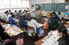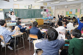 教科書の挿絵を見て、世界とのつながりについて考えています。