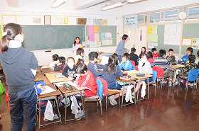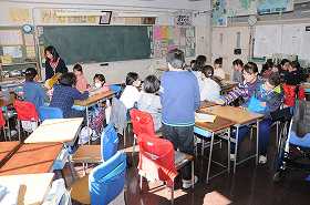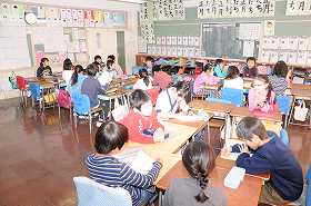 たてわり班りごとに決められた教室に集まり、6年生を送る会の準備をしています。