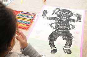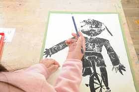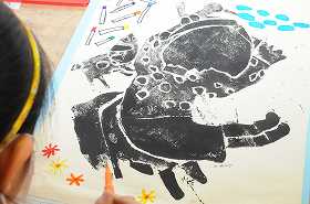 「うつして みつけて」をテーマに、版画に背景を書き足して作品を完成させています。