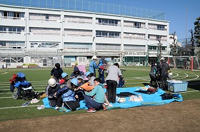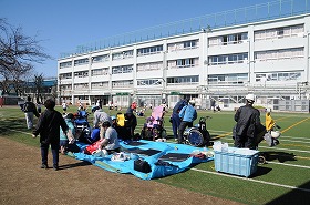 今日は大地震を想定した避難訓練を行っています。教室から校庭にまず避難しました。