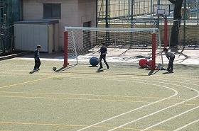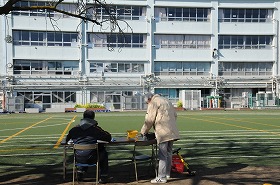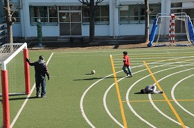 ランドセル広場が始まりました。集団下校で家に帰った子どもたちが学校へ来て遊んでいます。