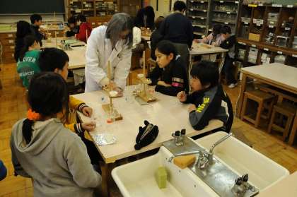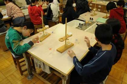 ミョウバンと塩の水溶液を「ろうと」を使い、水溶液をこしています。