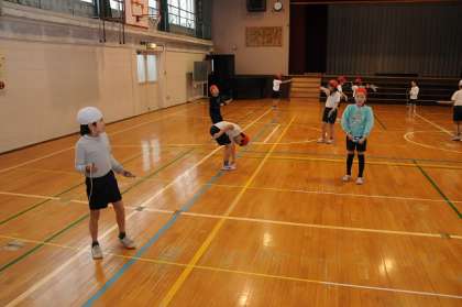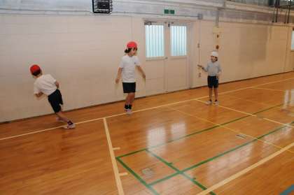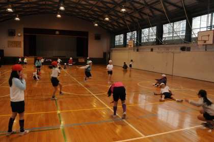 体育館でなわとびの技の練習をしています。
