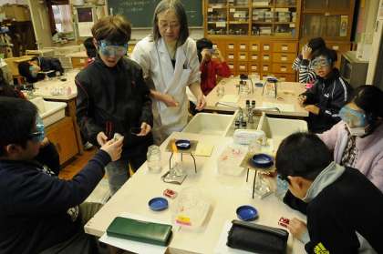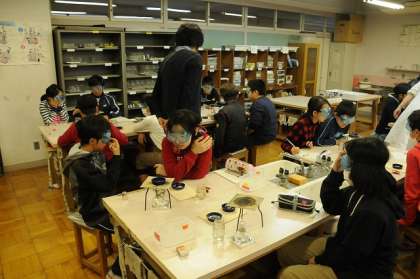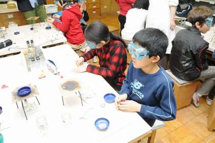 ろ過した水溶液をアルコールランプで熱して、蒸発している様子を観察しています。