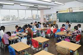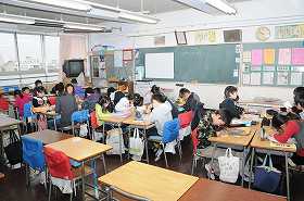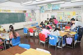 今日はたてわり班ごとに決められた教室に集まり、1年間お世話になった自分の班の6年生に1〜5年生がメッセージカードを書いています。5年生は自分のカードを書くだけでなく、1〜4年生のカードを見てあげるなどの世話をし、来年最高学年になる準備をしています。