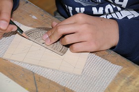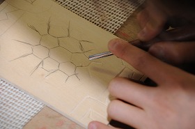 「色を重ねて」をテーマに、彫刻刀の安全な使い方を知り、木版に彫刻しています。