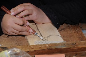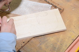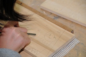 「私はデザイナー」をテーマに、彫刻刀を使いデザインにそって木彫しています。