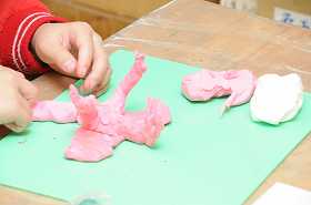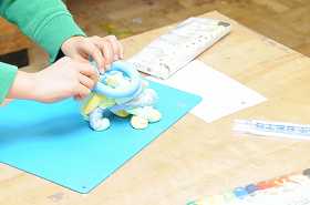 「ねんどであそぼう」をテーマに、紙粘土の一つのかたまりから自分が考えた生き物を作っています。