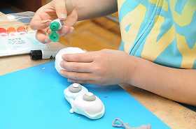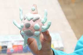 「ねんどであそぼう」をテーマに、紙粘土の一つのかたまりから自分が考えた生き物を作っています。