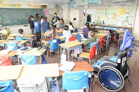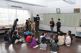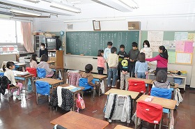 なの花タイムでお世話になった6年生にメッセージカードを渡しています。