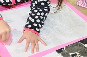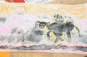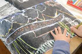 「はんで広げたゆめ」をテーマに、刷り上がり、できあがった版画を台紙に貼っています。
