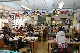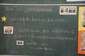 「はんで広げたゆめ」をテーマに、刷り上がり、できあがった版画を台紙に貼っています。