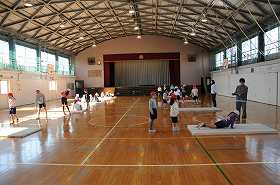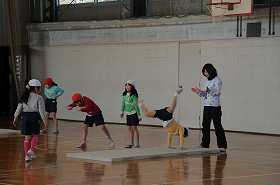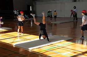 マットを使っていろいろな運動をしています。今日は健康トレーナーが授業支援をしています。