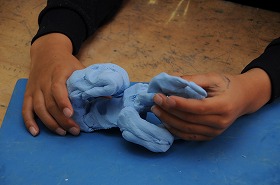 「ねんどであそぼう」をテーマに、紙粘土の一つのかたまりから自分が考えた生き物を作っています。