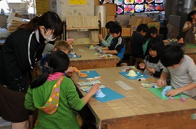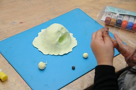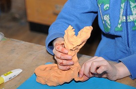 「ねんどであそぼう」をテーマに、紙粘土の一つのかたまりから自分が考えた生き物を作っています。