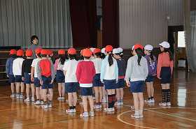 マットを使っていろいろな運動をしています。今日は健康トレーナーが授業支援をしています。